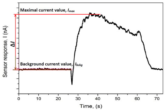 Assessment of steady-state response (ΔIX, T) towards particular gas or VOC (here indexed as ‘X’) at temperature (here indexed as ‘T’) of the WO3/WO3−x-based sensor has been determined as the difference of current (ΔI) between a background current (Ibckg) and current registered when signal reached its maximal value (Imax) (Figure 2). Then, in order to compare all signals towards different VOC/gases at different temperatures the normalization was performed versus the highest signal, which was registered for methanol at 250 °C (ΔIMethanol, 250 °C), and the normalized signal (RX, T) was calculated for each particular gas and VOC (here indexed as ‘X’) at particular temperature (here indexed as ‘T’), RX, T (in %) values was calculated in the following way: