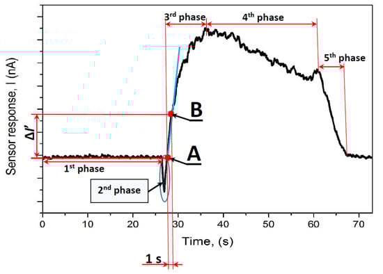 - Current increase rate (ΔI′X, T) towards particular gas or VOC (here indexed as ‘X’) at particular temperature (here indexed as ‘T’); ΔI′X, T was calculated as a change of the current within one second of measurement between points A and B, which are indicated in Figure 3; the calculation of current increase (ΔI′X, T) between point A (Figure 3, point A), which corresponds to the point when amperometric signal is passing the baseline value after the short-lasting second phase and point B (Figure 3, point B), which corresponds to the point registered during 1 s of the registration of point A.