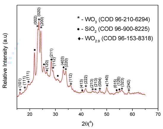 XRD spectrum of WO3/WO3 − x-based layer prepared from PTA + EtOH sol-gel and annealed at 500 °C for 2 h.