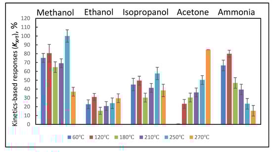 Some differences in normalized signal values are observed between data presented in Figure 6 and Figure 7, which provide differently assessed responses of WO3/WO3−x-based sensing layer towards VOCs (methanol, ethanol, isopropanol, acetone) and ammonia gas at temperatures between 60 and 270 °C. Despite some differences in normalized analytical signals presented in both figures (Figure 6 and Figure 7) the tendency remains the same. However, more precise comparison of presented data clearly shows that the assessment of steady-state based analytical signal—RX, T (Figure 6), provides higher analytical signal discrepancies, which are indicated as standard deviations for each signal, in comparison to that observed during the assessment of analytical signal based on response kinetics—SX, T (Figure 7). Moreover, the registration duration, which is required for the calculation of steady-state based analytical signal (RX, T), is several times longer in comparison to that, which is required for the calculation of response kinetics based analytical signal (SX, T), due to long-lasting achievement of steady-state conditions.