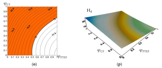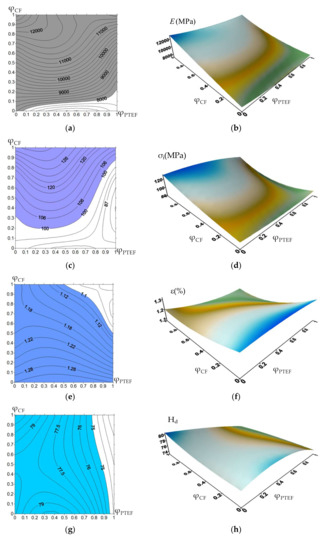 Initially, the specified operational properties for the PPS-based composites were prescribed (Table 4). The 3D surfaces and their corresponding contour fields for the PPS-based composite had different degrees of filling with CF and PTFE, see Figure 6 (PPS content is on the X-axis, CF content is on the Y-axis). The degrees of filling were the control parameters. The obtained results have proven the influence of these parameters on such operational properties of the composites as (i) density, (ii) bending modulus and strain, (iii) flexural strength, (iv) Shore D hardness, (v) friction coefficients, and (vi) volumetric wear on the metal and ceramic counterparts.