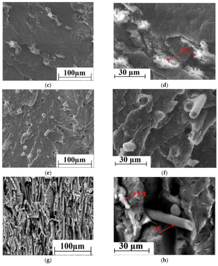SEM micrographs of the permolecular structure of unfilled PEEK sample, as well as the PEEK-based two- and three-component composite samples are shown in Figure 3. It is seen that loading of PTFE significantly worsened uniformity of the structure (Figure 3c,d). However, satisfactory interfacial adhesion between CF and the PEEK matrix was evident (Figure 3e,f). A quasi-uniform fiber distribution was found in the polymer matrix of the three-component composites (Figure 3g,h), but the structure was not uniform in this case.