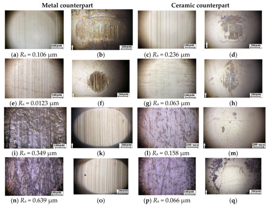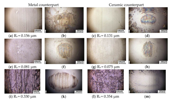 Wear track surfaces of the friction pairs were then analyzed to determine reasons of the observed phenomena; these phenomena occur because of optical photographs of the sample wear track surfaces of unfilled PPS and the PPS-based composites, as well as the metal and ceramic counterparts are presented in Figure 10. It is seen that microgrooves oriented in the sliding direction had formed on the surface of the unfilled PPS samples during the test on the metal counterpart (Figure 5a). The same microgrooves were found on the surface of the metal counterpart (Figure 10b). At the same time, the surface of the ceramic counterpart was slightly damaged. Its worn out area (scar) was smaller than the similar one on the surface of the metal counterpart (Figure 10d). However, surface roughness of the wear track of unfilled PPS sample was less than after testing on the metal counterpart.