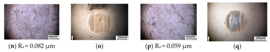 Wear of both counterparts was almost not found after tests of the “PEEK + 10% PTFE + 10% CF” three-component composite sample (Figure 5o,q). The friction surface of the polymer composite was smooth with almost no grooves (Figure 5n,p). Its roughness was lower than that on the unfilled PEEK sample. Thus, it can be concluded that PTFE had acted as a solid lubricant under conditions of dry sliding friction. This had enabled to protect the surfaces of the sample and the counterparts from the micro-abrasive damaging. Friction coefficient and wear rate had significantly decreased due to this fact (Table 3).