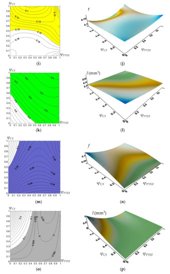 Initially, 3D dependences of operational properties of the PEEK-based composites containing 5%, 10%, and 17% CF, as well as 5%, 10%, and 17% PTFE (hereinafter all percentages are presented by weight) on control parameters were drawn (Figure 1 and Figure 2). Experimental data supplemented to continuous functions using the Lagrange interpolation polynomial were used. Then, regions corresponding to their specified operational properties (Table 1) were limited on the surfaces.