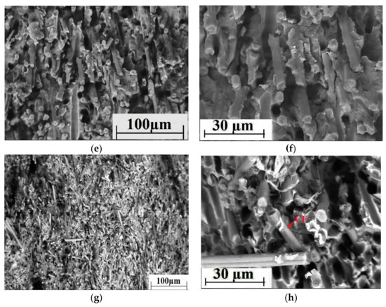 SEM micrographs of the permolecular structure: (a,b) PEEK and (b–h) the PEEK-based composites ((c,d) PEEK + 10% PTFE, (e,f)–PEEK + 10% CF, and (g,h) PEEK + 10% PTFE + 10% CF.)