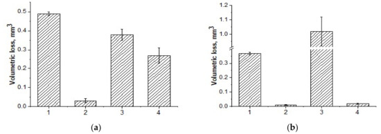 Volumetric wear: (a) on the metal counterpart and (b) on the ceramic counterpart (1–PPS, 2–PPS + 15% PTFE, 3–PPS + 20% CF, 4–PPS + 15% PTFE + 22.5% CF).