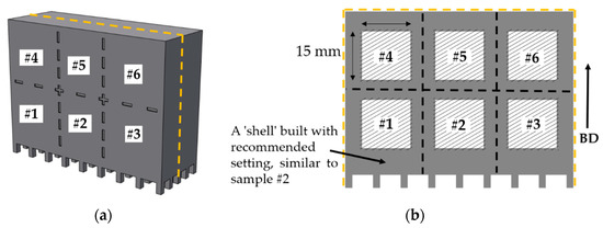 Schematic of the CAD model of one of multiple identical blocks comprising the electron beam melting (EBM) build (a), and cross-section view of the block revealing the cubes (marked by hatched lines) processed with different line spacing (b). The arrow on the right shows the build direction, BD.