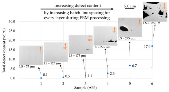 The as-built microstructures of samples processed with varying LS corresponding to different melting speeds (Table 1) are depicted in Figure 2. Increase in LS above the “recommended” value resulted in a rise in the defect content, as shown in Figure 2. The defect contents stated represent the sum of all types of defects observed in the as-built samples, i.e., gas and shrinkage porosity, and lack of fusion. Incidentally, these defects were also present in samples produced at the recommended LS = 125 µm (AB#2) as well as at lower LS = 75 µm (AB#1). Samples intentionally produced with higher LS exhibited defect contents up to 17%, as shown in Figure 2 and also visualized in accompanying micrographs. In a word, a systematic increase in line offset (processing speed) from 75 to 325 µm resulted in an increased defect content ranging from 0.1% to 17% in the investigated samples. It is worth mentioning that large defects such as those observed in samples AB#5 (LS = 275 µm) and AB#6 (LS = 325 µm) are not typical of an EBM built even with not fully optimized processing conditions [23]. However, these samples were produced for the present ‘proof of concept’ investigation regarding the extent of defect closure enabled through HIPing.