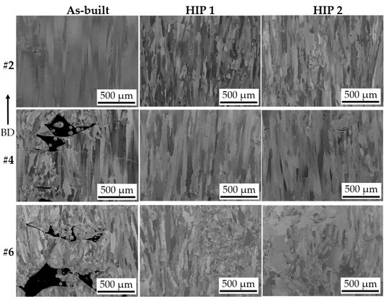 SEM micrographs showing defects in samples #2 (LS = 125 µm), #4 (LS = 225 µm), and #6 (LS = 325 µm) in as-built and HIP’ed conditions. The arrow indicates the build direction.