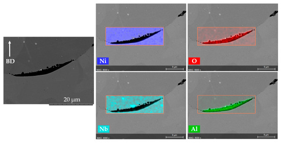 Samples with distinct defect contents, i.e., AB#2, AB#4, and AB#6 were subjected to two HIPing treatments to investigate the efficacy of defect closure. The defect contents in as-built samples AB#2, AB#4, and AB#6 (corresponding to LS = 125, 225, and 325 µm, respectively) were 0.5%, 2.6%, and 17%, respectively. After both the HIPing treatments, the defect content in all samples was significantly reduced, regardless of the original extent, as summarized in Table 4. Moreover, the difference in the extent of defect closure accomplished at 1120 °C (HIP1) and 1185 °C (HIP2) was not significant. The considerable densification of samples achieved by HIPing is also visualized from the microstructures in Figure 3. Furthermore, the small amount of remnant defects in all HIP’ed samples discussed were found to be typically associated with the presence of Al-rich oxide, which can inhibit complete defect closure. This is clearly evident from the representative EDS results given in Figure 4. It is worth mentioning that Al-rich oxides are thermodynamically very stable and not removed by HIPing, as previously observed in HIP’ed EBM Alloy 718 [24].