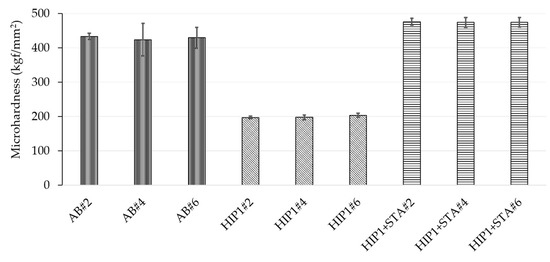 Microhardness values of the as-built and post-treated samples #2 (LS = 125 µm), #4 (LS = 225 µm), #6 (LS = 325 µm).