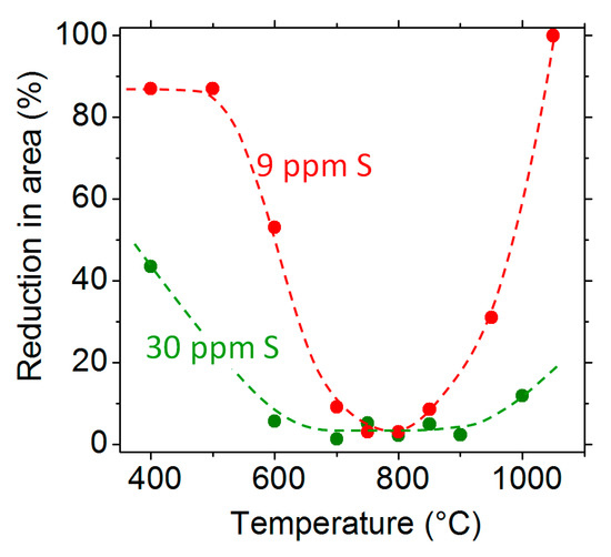Austenitic materials usually have a good ductility, which makes it possible to cold- or hot-deform them. In some circumstances, however, this ductility can be reduced at temperatures typically between 0.5 and 0.8 TM (melting temperature). This phenomenon is referred to as a “ductility trough”, “loss of ductility”, “hot-shortness”, “intermediate temperature embrittlement” or, sometimes, “ductility dip cracking (DDC)”, the latter being more popular in the field of welding. One very specific feature of ductility trough is that it is always associated with the occurrence of a grain boundary fracture. Many studies have shown the prime importance of trace elements, especially impurity sulphur, in the ductility trough of steels [1,2], nickel alloys [3,4,5] and copper alloys (see, for example, the review paper by Laporte and Mortensen [6]). Some of those early works on ductility troughs were conducted on model alloys of a very well-controlled purity at the ppm level, so as to identify the effects of individual elements. However, more recently, other microstructural features, like intergranular precipitates, were stated to have the most significant effect on the ductility trough of some nickel alloys [7,8]. It was even argued that, for some nickel alloys, no effect from impurity sulphur was expected in the ductility trough [7,8]. Some researchers have recently questioned the role of sulphur in the ductility trough—first, because of the absence of a clear correlation between the nominal sulphur content of industrial alloys and the intensity of their ductility troughs [7,8] and, second, because of the extreme difficulty, or even the impossibility, to demonstrate the presence of such impurities segregated at the grain boundaries [9]. It was then sometimes concluded that, as no grain boundary segregation was observed, the impurity could not be the cause of the ductility trough.