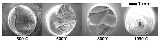 Figure 1 shows the reduction in area of the tensile specimens tested at different temperatures for the 9 ppm S and the 30 ppm S materials. The effect of the sulphur is clearly evidenced—the ductility trough is wider for the sulphur-enriched material. From 700 to 850 °C, the reduction in area is almost zero for the two materials, which demonstrates their extreme brittleness in that temperature range. The fracture surfaces of the 9 ppm S material at different temperatures are presented in Figure 2. The fracture is ductile at 500 and 1050 °C, which is consistent with the large reduction in area at those temperatures (87% and 100% at 500 and 1050 °C, respectively, see Figure 1). On the other hand, the fracture surface is entirely intergranular at 800 °C, and this is related to the zero reduction in area observed in Figure 1. At 600 °C, the fracture is partly intergranular and partly ductile.