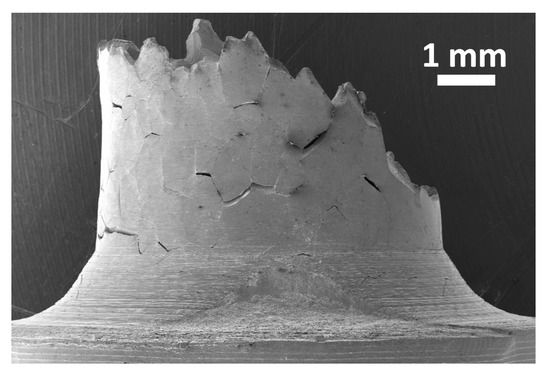 The side view of a 9 ppm S specimen, tensile tested at 750 °C at 8 × 10−5 s−1. Considerable secondary cracking is observed. A specimen 6 mm in diameter was used here (instead of 3.5 mm) to better evidence the grain boundary nature of the secondary cracks.