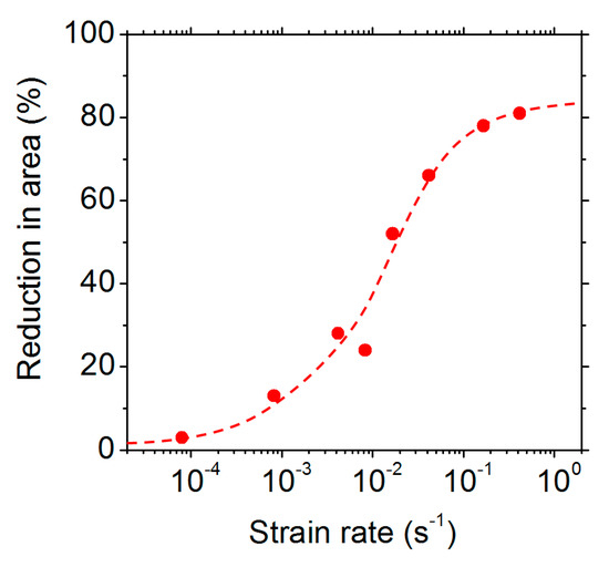 The reduction in area observed after tensile testing at 850 °C of the 9 ppm S material at different strain rates. A pre-heating step at 850 °C was conducted so that the total time spent at 850 °C for all the specimens was 40 min.