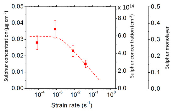 The sulphur concentration measured using wavelength-dispersive spectroscopy (WDS) on the fracture surface of the 9 ppm S specimens, tensile tested at 850 °C at different strain rates.