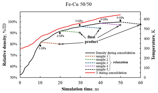 Cold sintering. For each of the seven nanopowder models, comprehensive stress was applied in the simulated periodicity cell up to the maximum of 5 GPa. The pressure in the system was gradually and linearly adjusted p[GPa] = rp × t, where rp = 0.1 GPa/ns—the rate of pressure increase, t—the time in ns. Isoenthalpic conditions were maintained in the system, H = const. Figure 1 shows changes in the relative density of the 50/50 nanopowder and its temperature during consolidation at up to 5 GPa (solid lines). The same dependencies for Fe–Cu 28/72 and Fe–Cu 72/28 nanopowders are shown in Figure S2.