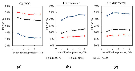 The calculated crystal structure of the Cu component – fcc (a), quasi-bcc (b) and disordered phase (c) as a function of consolidation pressure for three different Fe–Cu compositions: 28/72 (red), 50/50 (black), 72/28 (blue).