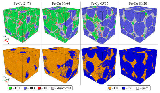 Adaptive common neighbor analysis was conducted for all 23 simulated samples (a-CNA) [44,45], and for each atom belonging to crystalline lattice the type of lattice was determined. This method does not determine the structure for atoms located at the surface of solid bodies or at the boundaries with the pore volume. In this research, the analysis is limited to four basic structure phases of Fe–Cu compacts: bcc and fcc lattices, hexagonal close-packed (hcp) lattice, and disordered phase. Other types of lattices in the simulated samples account for under 0.005%. The fourth type (disordered phase) includes both the material in the amorphous state and the atoms located at the boundary with the pore volume. It is worth mentioning that it is not correct to describe atoms located at the pore surface as disordered because locally the surface can be a face of a crystal. However, we will still refer to such atoms as disordered, assuming that the material is not in an ordered/periodic volumetric (bulk) phase.