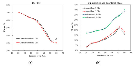 For all the compositions, the content of the disordered phase increases with pressure up to 2 GPa and remains constant at pressures above (Figure 5c). The higher the content of Fe in the nanopowder, the larger the percentage of disordered copper. This is because for the higher content of the Fe phase its surface area is also larger and the space not occupied by iron has a more tortuous and complex shape. Plastic flow of copper into this space generates high shear stresses causing copper to undergo considerable phase transformations. As a result, the fcc phase ratio in the copper component of 80/20 Fe–Cu samples can be as low as 30% (vs. 70% for the 21/79 sample) (Figure 7a), and the disordered phase ratio as high as 40% (vs. 17% for the 21/79 sample) (Figure 7b).