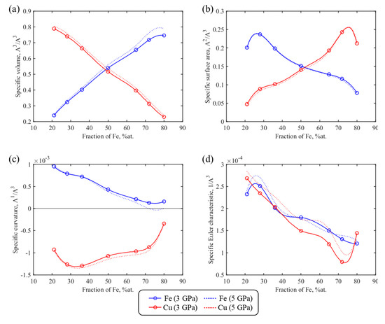 That is why we propose to evaluate four Minkowski functionals for the numerically simulated (synthetic) samples. The four functionals are specific volume, specific area, surface curvature, and the Euler characteristic calculated for the spatial distribution of both the elements and their phases. We would also like to obtain the dependence of these functionals on the cold-sintering parameters: consolidation pressure and elemental nanopowder composition. According to Hadwiger’s theorem [30], any additive, rotation, and translation invariant physical property can be represented as a linear combination of Minkowski functionals. Specifically, in our case Minkowski functionals and their dependence on the cold-sintering parameters can be used for estimating the properties and formalizing the structure–property relationship of Fe–Cu nanocomposites.