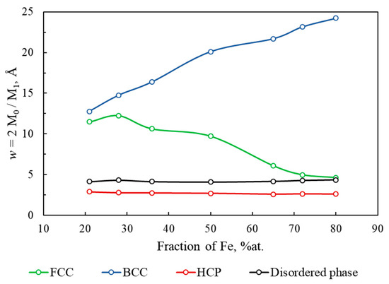 In Figure 9, w(X) of different phases present in simulated Fe–Cu nanocomposite is shown as a function of iron content. It can be seen that the hcp phase (red line) has the lowest value of w(HCP) ≈ 2.7 Å that is independent of Fe content. This is quite reasonable given the results in Figure 6 showing that the hcp phase is distributed as stacking faults two atomic layers thick. The thickness of the disordered phase (black line) is only slightly larger (w ≈ 4.2 Å) and is also independent of the sample composition. This is again in agreement with phase distribution in Figure 6 where the disordered phase appears as a several-atoms-thick layer between Fe and Cu regions or grains (crystallites) or between differently oriented same metal grains.