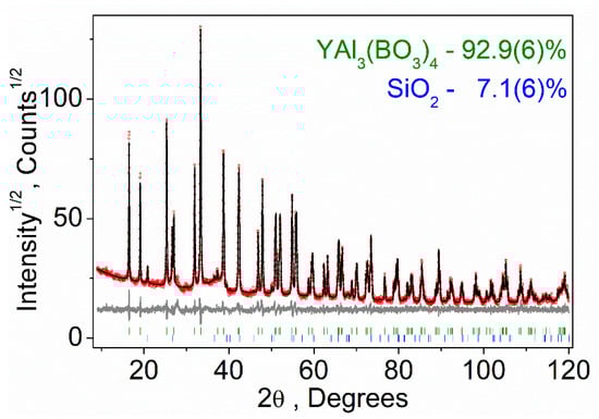 The X-Ray powder diffraction data of YAl3(BO3)4 was collected at room temperature with a Bruker D8 ADVANCE powder diffractometer (Cu-Kα radiation, 40 kV, 40 Ma, Bruker, Billerica, MA, USA) and linear VANTEC detector. The step size of 2θ was 0.016°, and the counting time was 1 s per step. The intensities from single crystal YAl3(BO3)4 of 0.2 × 0.1 × 0.1 mm dimensions were collected at 296 K using the SMART APEXII X-ray four-circle single crystal diffractometer (Bruker) equipped with a CCD-detector, graphite monochromator and Mo Kα radiation source. The cell parameters were refined by 1525 reflections. The X-ray data from crystal were measured with the exposure time of 10 s on each frame. Crystal rotated along ω-axis by 0.5° at the fixed φ angle and the ω value was increased from 0° to 182°. Totally the 364 frames were measured at each fixed φ equal to 0°, 120° and 240°. After that, the program APEXII from Bruker integrated the intensities of reflections. Space group R32 was defined by the analysis of extinction rules and intensity statistics obtained from all reflections. Multiscan absorption correction of reflection intensities was performed by APEXII software (Bruker, Billerica, MA, USA). Then, the intensities of equivalent reflections were averaged.