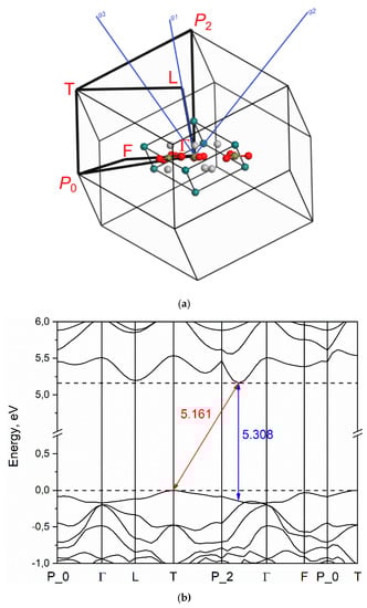 The high-symmetry points of the BZ are selected as P0–Γ–L–T–P2–Γ–F–P0–T for calculation of the YAB band structure. The coordinates of the special points of the Brillouin zone are: P0(0.298, −0.702, 0.298), Γ(0, 0, 0), L(0.5, 0, 0), T(0.5, −0.5, 0.5), P2(0.301, 0.301, 0.301), F(0.5, −0.5, 0), T(0.5, −0.5, 0.5) [50,51] and points are shown in Figure 3a. The results of the calculation of the yttrium aluminum borate band structure are presented in Figure 3b.