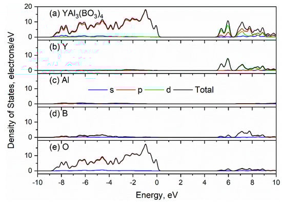 Total (a) and partial density of states (b), (c), (d), (e) of YAl3(BO3)4.