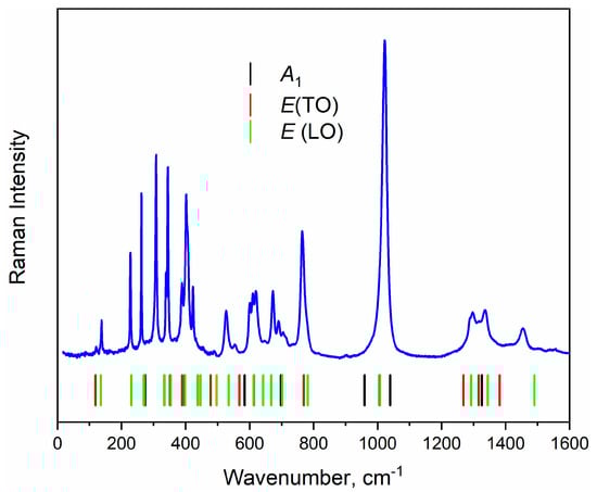 The nonpolarized Raman and Infrared spectra are shown in Figure 6 and Figure 7 correspondingly. Polarized Raman spectra are plotted in Figures S2 and S3 and simulated Raman spectra for specific Raman tensor components are shown in Figures S2–S4 of supplementary materials. The mechanical representation for the YAl3(BO3)4 at Brillouin zone center is Γvibr = 7A1 + 13A2 + 20E [60] where Raman active modes are ΓRaman = 7A1 + 19E, and infrared active modes are ΓInfrared = 12A2 + 19E. The acoustic modes are ΓAcoustic = A2 + E. The A and E letters correspond to nondegenerate and doubly degenerate vibrations correspondingly. The E modes are polar and active as in Raman as in IR spectra.