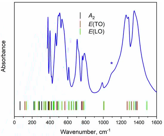 Infrared absorption spectra of YAl3(BO3)4 in Mid-IR sub region, and the artefact is shown with an asterisk. Vertical lines show the positions of calculated IR-active bands.