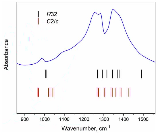 The IR absorption spectra of YAl3(BO3)4 in the range of stretching vibration of BO3 triangles in comparison with calculated wavenumbers (vertical lines) of IR-active vibrations in trigonal (R32) and hypothetical monoclinic (C2/c) structures.