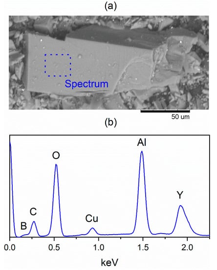 The energy-dispersive X-ray (EDX) microanalysis was used to study the elemental composition of YAl3(BO3)4 crystals (Figure 9a). The component spectrum (Figure 9b) contains peaks of boron, oxygen, aluminum, yttrium, carbon and copper. The last one is related to the copper substrate. It is well known that EDS, in contrast to Auger spectroscopy, is a more accurate method for heavy elements (atomic number > 33). That is why the carbon quantity in the spectrum is overestimated. Moreover, there are a lot of carbon contaminants in any SEM chambers, that affect carbon quantity in spectra. In addition, a carbon conductive double-coated tape was used to mount the sample to operate in SEM. We cannot exclude from the discussion the molybdenum because molybdenum oxides are part of the synthesis components, however, molybdenum is not found.