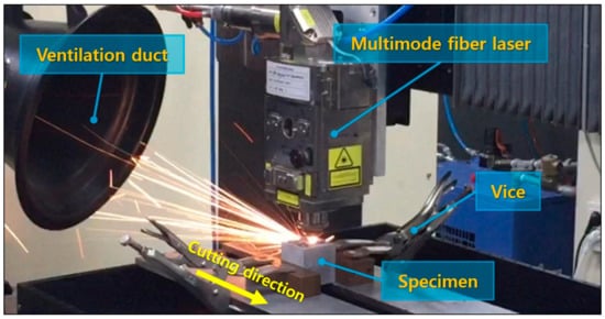 2 assistant gas is fixed at a pressure of 7 bar. The specimens are placed on the test bed and fixed with a vice; whereas, this table-mounted system might not be required in actual applications due to relatively large-scaled fixed concrete structures. The test bed is composed of two metal plates and is arranged horizontally with the interval of 6.5 mm to remove the molten cement particles. The laser beam is irradiated perpendicular to the cement composite from the moving head. A ventilation duct is placed on the opposite side of the laser moving direction to collect dust particles that occurred during experiments. The laser power is set to 9 kW, and the laser scanning speed is designated as the only controllable parameter to simplify the experimental parameters. The laser cutting speed is reduced from 4 m/min to 1 m/min at 1 m/min intervals. Additionally, the laser cutting speed of 0.5 m/min and 0.25 m/min are used.
