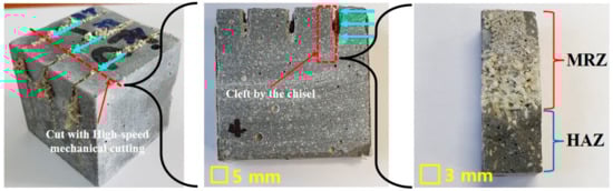 Figure 3 shows a fabrication process of the specimen after laser irradiation. First of all, the cement-based material is cut by the high-speed mechanical cutting. After the cutting, the specimen is split by the chisel to observe the cut surface affected by laser. If a mechanical cutting machine is used during this process, the microstructure of the cut surface on the specimen is affected by the heat generated during the mechanical cutting. Therefore, the specimens are cleft by the chisel and used for SEM/EDX analysis. In addition, the cut surface of specimen is classified into the Material Removed Zone (MRZ) and Heat Affected Zone (HAZ). MRZ is the area where the material is vaporized and removed by laser. On the contrary, HAZ is the area where material is not removed and only affected by heat [