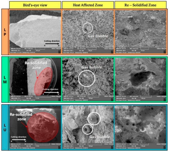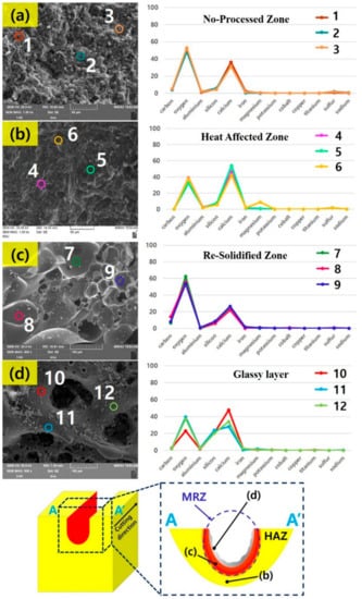 27]. Unlike LM and LU, LP shows the least Re-Solidified Zone, which is the resolidified area after the specimen is melted by the laser. Additionally, small pores of less than 10 μm are observed compared to other specimens. In the LM, the resolidified zone is partially observed, and pores of about 30 μm or more are noted in the glassy layer. The glassy layer is the layer structure in which the silicon with a high vaporization point is in part evaporated by the laser and is resolidified from the molten state. The LP formed a small amount of silicon, so the glassy layer was not formed. Unlike LP, both LM and LU were mixed with silicate-based materials such as silica sand, silica fume and silica powder. As the amount of silicate-based materials increases, the thickness of the glassy layer increases. To observe the change of the chemical composition in the laser irradiated area, the components of the no-processed zone, glassy layer, HAZ and re-solidified zone are analyzed through EDX, and it is shown in