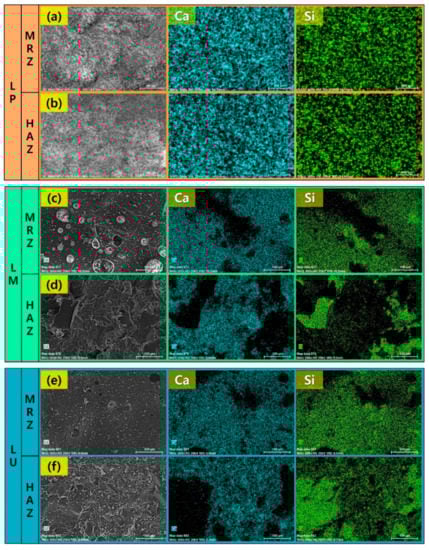 Figure 6b,d,f). In case of the LP specimen, the compositional distribution of calcium and silicon is similar to the microstructures of the MRZ and HAZ. On the other hand, in the LM and LU specimen, the components of calcium and silicon are similar in MRZ. However, in HAZ, silicon is observed in areas without calcium. The cement and silicate-based materials are melted due to the laser irradiation, and then mixed with each other. After that, the molten concrete is resolidified in a mixed state. Therefore, calcium and silicon show a similar distribution in the MRZ. On the other hand, calcium and silicon in the HAZ do not mix with each other since the temperature of the cement-based materials remained in a solid phase. Thus, the LM and LU are mixed with silicate-based materials so that the distribution of calcium and silicon is clearly observed. However, in the LP specimen, this distribution is not apparent due to the cement paste being mixed only with cement and water.