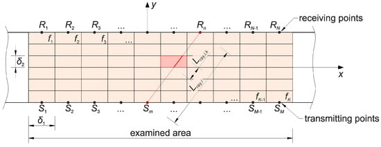From the mathematical point of view, by indirect visualization of the material structure by means of maps of distributions of quantities characterizing the propagation of ultrasound waves, it is necessary to build an appropriate system of equations (e.g., Reference []). The plane problem assumes that the reconstructed image consists of a finite number of plane cells which, in the examined area, is separated by an orthogonal grid of a step of (Figure 1). The function is searched for in an approximate way: