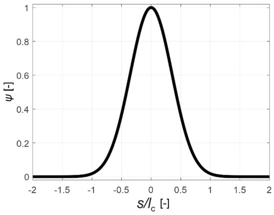 where: —local equivalent tensile strain [-]; —local principal strain [-]; —representative volume of the material (m3), —variable describing the position along axis (m); , —starting and ending point of the considered element (m); —cross-sectional area of the element (m2); —the characteristic dimension of the non-locality or the so-called internal length (m); —weight function [-]; —Macauley’s operator. Variability of function is adopted in the model identical to the normal distribution with standard deviation . It also means that the range of the non-locality practically ceases to be significant above the distance because (Figure 2). In addition, in the case of uniaxial tension, where is the normal strain along the axis of the beam, will be equal to this deformation at the moment of initiation of the damage evolution, and can reach a maximum value of where is the tensile strength. In the incremental version needed for the numerical analysis of the problem, the stress and damage evolution Equations (8)–(10) take the following forms: