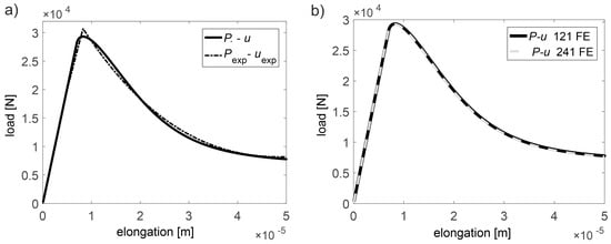 The tests included in Reference [] were also selected for analysis due to the fact that the shape of the specimens enables, in tension, the location of the brittle damage zone in their middle area, leading to the formation of a single macro-crack when the load capacity is exhausted. In the considerations, for the sake of simplification, a bar in tension of variable cross-section was used as a model of specimens, according to their geometrical features. This choice was dictated by the need to carry out the calculation procedures described below in an acceptable time frame due to the computer hardware available (PC with a processor GHz and RAM GB—time of solving one task approximately min). The boundary problem analyzed was solved using the finite element method (FEM) in an incremental version using physical Equations (15),(16). Two-node bar finite elements with 2 degrees of freedom and constant and averaged over the length physical and geometric features (with one integration point in the middle of the element) were used. One hundred and twenty-one finite elements were adopted on the axis of the specimen of the length of cm. In addition, the load increments of the specimen were assumed to be continuously elongated during the calculation, which meant switching the force sign at the transition to the weakening phase. The force increment, in turn, was selected in each step so that the increments in elongation of the measuring base and normal strain in each of the elements would not exceed, respectively, the values of μm and . Taking into account the above mentioned conditions of calculations allowed to obtain a satisfactory convergence of the solution. Further increase of the number of elements and decrease of permissible increments of strain and displacements did not significantly affect the result (Figure 4b).