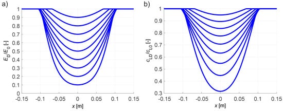 where: , —the velocity of the longitudinal wave in the virgin and damaged material, respectively, (m/s). Based on relations (19), (20), variabilities of Young’s modulus and longitudinal wave velocity are shown in Figure 6 which correspond to the damage parameter distributions from Figure 5b. They will be used in the computational examples presented in point 4 that illustrate the problem of tomographic detection of cracks in concrete members at various stages of their evolution.