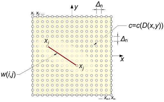 where: —considered wave speed (m/s), —variable describing the position on a straight line section joining points and (m). In general, it can be seen that the more nodes evenly covering the area (e.g., assuming an orthogonal grid of points —Figure 7), the more accurate the calculation will be carried out. To increase the time efficiency of the method, when we are only interested in the time of sound propagation between selected two points, the number of nodes can be reduced only to those that lie within a reasonable distance from the straight line connecting these points and/or do not place nodes in a sub-areas where it is known that . If the graph is constructed, it is possible to use Dijkstra’s method in a standard way, i.e.,: