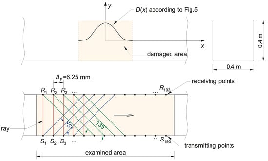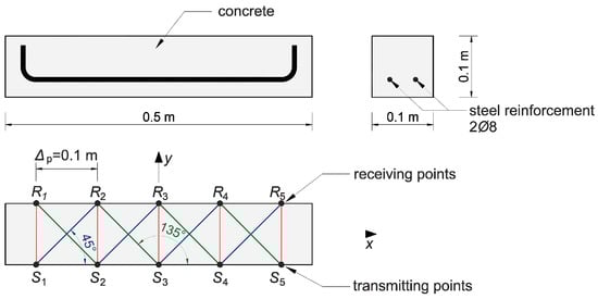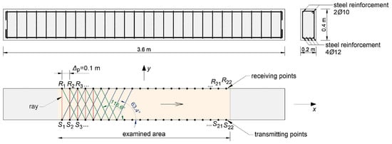 The considerations presented in the paper concern the case of concrete beams that contain elastically degraded zones (in the form of grouped micro-cracks or cracks) running across the entire cross-section—e.g., as a result of simple bending or tension. Therefore, tomographic analyses were narrowed down to the identification of brittle damage in a flat longitudinal section of beam which will also be the plane of symmetry of this element, focusing on the assessment of changes in the speed of ultrasonic waves due to a local change in the stiffness of the cracked material. For this reason, in all computational examples and experimental studies presented in the paper, a system of opposite transmitting/receiving points of ultrasound waves in the transmission mode was used (Figure 1). Longitudinal waves have been selected as non-dispersive and the fastest of all ultrasonic wave types for the study. This requires, however, that their length should be small enough in relation to the dimensions of the cross-section of the element to be effectively generated (practical recommendations in this respect can be found in, e.g., Reference []). On the other hand, it limits the distance between the intended transmitting/receiving points because of the attenuation of the longitudinal waves and the angle at which they may propagate from the transmitting point in an effective manner in reception because of the amplitude distribution. In the latter case, on the basis of individual experiences of the authors, the angle of inclination of diagonal rays to a bar axis was limited to range from 45° to 135°; in Reference [], a numerical simulation of the process of propagation of ultrasounds during its excitation by the transducer was performed where it was shown that the amplitudes of longitudinal waves are negligible in contrast to transverse waves outside this angular range, which may result in incorrect and increased propagation time reading.