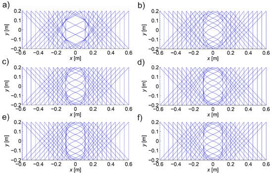 The shape of the paths of the fastest propagation between the selected transmitting/receiving points in the longitudinal section of the beam with the area damaged at and (a) mm, (b) mm, (c) mm, (d) mm, (e) mm, and (f) mm.