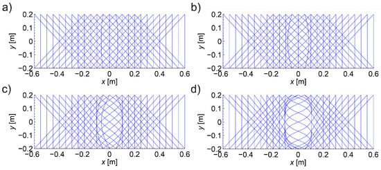 The shape of paths of the fastest propagation between the selected transmitting/receiving points in the longitudinal section of the beam depending on the degree of elastic degradation in the damaged zone (a) 0.9, (b) 0.8, (c) 0.6, and (d) 0.2 (for mm).