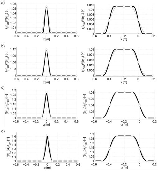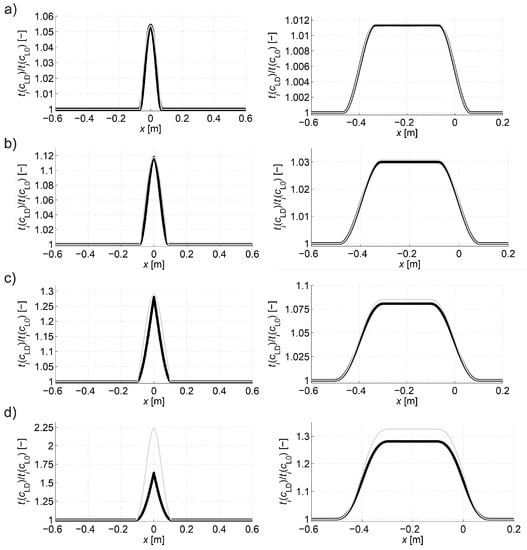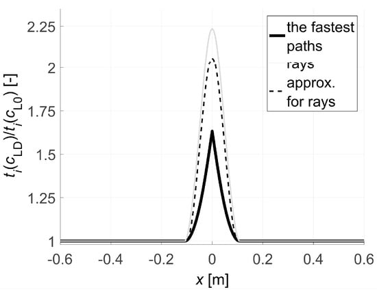 Thus, the factor scales propagation times from real paths by elongating them in relation to the minimum value in the direction of positive values so as to bring their course as close as possible to the times that would correspond to the passage of a wave over the straight ray. As a result, this will clearly result in a reduction of calculation errors. Analyzing the graphs shown in Figure 11, this factor can be determined, e.g., from the least squares method. However, in a situation of actual measurement, due to the lack of such data, this is impossible. Therefore, the authors propose to apply the following heuristic approach to the determination of . Approximate solution of the system of Equation (3) can be alternatively obtained using Tikhonov’s method [,] minimizing the function of the mean square error of this solution (the so-called residual term ) with additional consideration of the regularisation term (e.g., Reference []). Using this approach in the measurement situation, when in Equation (3) we replace the appropriate components in the vector across , we will obtain: