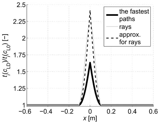 In the same way as in the first example, the propagation times for the fastest ultrasound wave paths connecting opposite transmitting/receiving points were modified to bring them as close as possible to the propagation times of straight rays, but with the use of times , i.e.,: