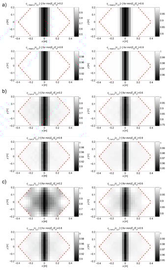 where: —rectangular area occupied by the -th cell (m2). Integral (26) was calculated in an approximate way using the rectangular method, taking the step of integration after and , respectively as and . Therefore, relative errors were calculated for each reconstruction: global—mean square and local—maximal , where was determined from system of Equation (3). Because is not known in a real measuring situation, it is also necessary to introduce a measure which will allow to estimate the reconstruction errors due to the assumption of straight-lined rays without this information.