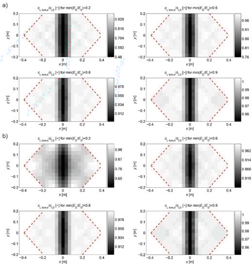 In order to assess the correctness of the proposed approximation method, appropriate tomographic reconstructions of the longitudinal wave velocity maps in the beam model section from Figure 8 are presented in Figure 13. The reconstructions were determined by the randomized Kaczmarz method in accordance with the information presented in point 2, where was adopted as . The results are shown only for the central area of the beam separated by a red dashed line through which all types of rays passed due to their inclination. Wave velocity distributions in the damaged area according to Figure 6b were assumed with minimal ratio equal to 0.9, 0.8, 0.6, or 0.2. The resolution of cm cm was applied, as well as the number and arrangement of rays, as shown in Figure 8. For comparison purposes, in addition to the reconstruction with the use of times according to relation (22) and , the original map is also shown on the basis of data from Figure 6b, but in the resolution used, i.e., in each cell, its average speed value is taken from the formula: